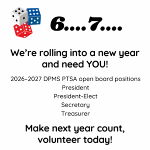 Without volunteers in these roles, we will not be able to have a PTSA at DPMS. We sincerely hope you’ll consider serving—your time and talents truly make a difference.